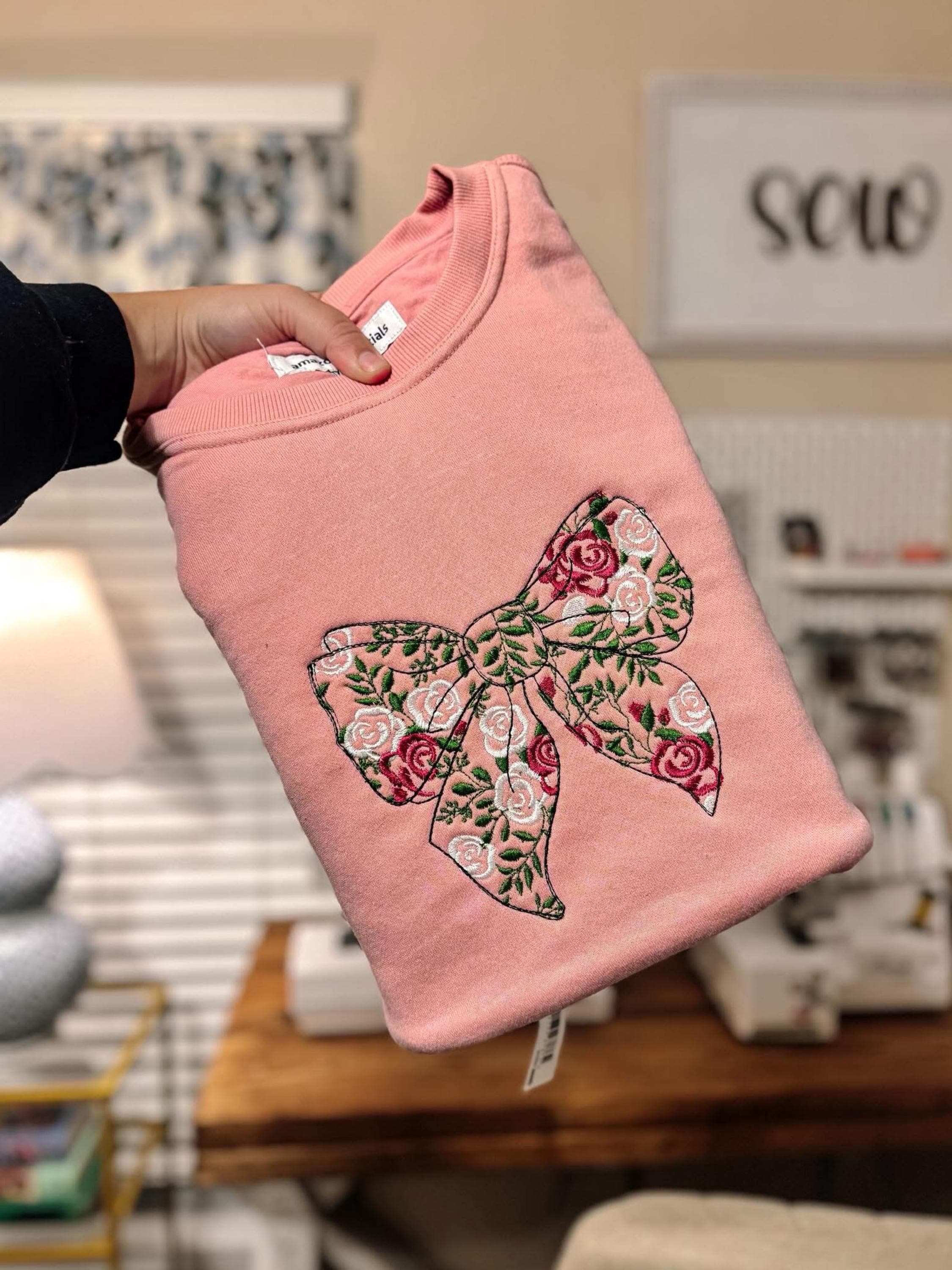 T shirt sweatshirt modern design Floral pretty bow drawing light sketch stitch machine embroidery designs in many sizes 4, 5, 6, 7, 8, 9 inches girl flowers flowered ribbon
